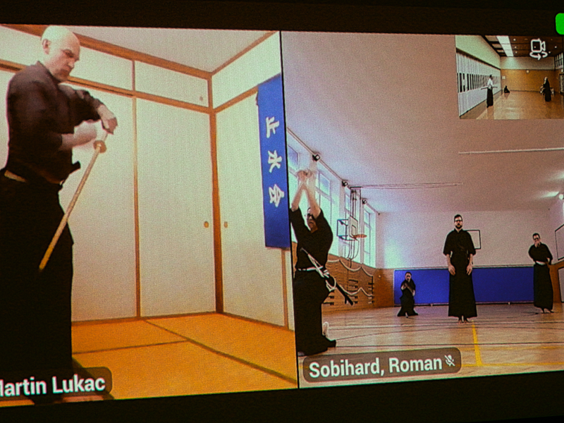 初めての試みであり、機器の設定に少し時間がかかりましたが、スロバキア道場、広島・マーチン氏、青葉道場の3か所を繋ぐ、稽古会が実現致しました。